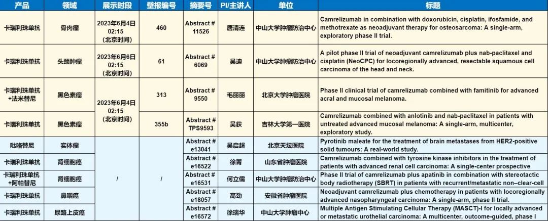 此外,在头颈肿瘤、黑色素瘤、骨肉瘤、鼻咽癌、肾细胞癌、尿路上皮癌等多个领域,卡瑞利珠单抗、吡咯替尼等产品相关研究一共入选了4项壁报展示和5项线上发表,彰显了AG百家乐医药强大的自主研发综合实力。